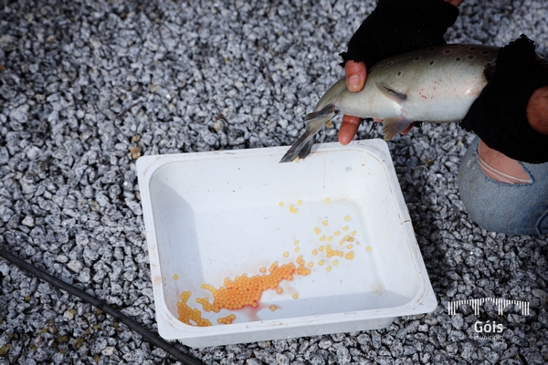 No final, os pequenos visitantes tiveram oportunidade de assistir ao processo da desova, por fecundação artificial, através de compressão abdominal, o qual permite assegurar a preservação desta espécie muito sensível à poluição e ao aumento da temperatura.