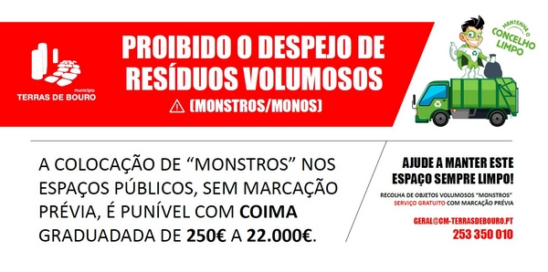 Nos últimos meses tem-se vindo a assistir ao aumento do abandono indiscriminado na via pública de colchões, eletrodomésticos (frigoríficos, máquinas de lavar, televisões, etc.), mobílias velhas, entre outros resíduos volumosos, constituindo esta ação uma contraordenação, punível com coima, nos termos da legislação em vigor e do Regulamento do Serviço de Gestão de Resíduos do município. Lembramos que existem formas adequadas e gratuitas para o descarte destes objetos volumosos, tornando-se inqualificável o despejo ilegal de resíduos na via pública.