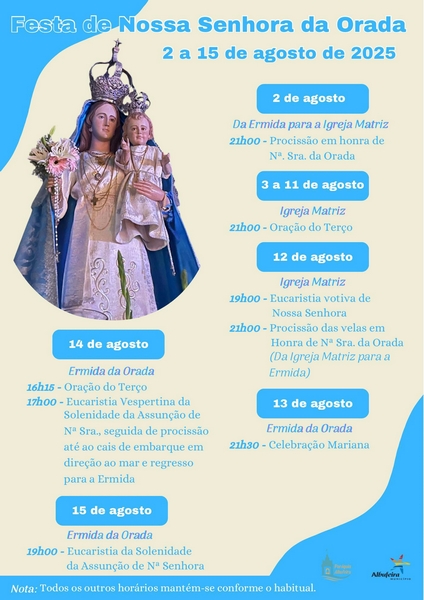 As comemorações em honra de Nossa Senhora da Orada encerram a 15 de agosto, dia de Solenidade da Assunção de Nossa Senhora, com a Eucaristia a celebrar às 19h00, na Ermida da Orada.