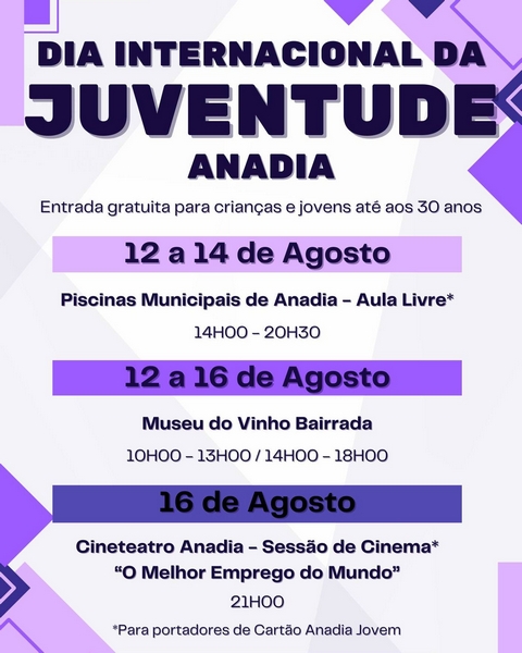 O Município de Anadia vai celebrar esta terça-feira, 12 de Agosto, o Dia Internacional da Juventude, proporcionando às crianças e jovens até aos 30 anos, residentes no concelho, a oportunidade de usufruírem, sem custos, dos serviços disponibilizados, nomeadamente nas Piscinas Municipais, no Museu do Vinho Bairrada e no Cineteatro Anadia.