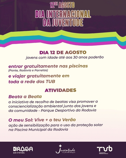 No dia 12, os jovens bracarenses com idade até aos 30 anos poderão entrar gratuitamente nas Piscinas Municipais da Ponte, Rodovia e Parretas, bem como usufruir de viagens gratuitas em toda a rede dos Transportes Urbanos de Braga (TUB).