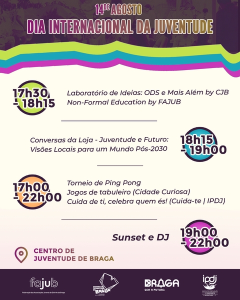 As celebrações prolongam-se até quinta-feira, 14 de agosto, no Centro de Juventude de Braga. Pelo quarto ano consecutivo, o Município de Braga, o Centro de Juventude, a FAJUB – Federação das Associações Juvenis do Distrito de Braga – e o IPDJ – Instituto Português do Desporto e Juventude dinamizam um programa que inclui atividades colaborativas, momentos de reflexão e a já habitual Sunset Party, que encerra as comemorações.