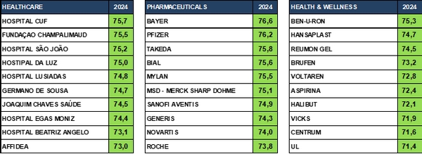 Numa escala de 100 pontos, entre mais de 2.000 marcas auditadas (associadas a mais de 70 setores de atividade) ao longo de todo o ano e que foram previamente identificadas de forma espontânea por mais de 50.000 cidadãos que refletem a sociedade em termos de distribuição geográfica, género, idade, grau de formação e classe social, este estudo destaca agora as 10 marcas de SAÚDE e BEM ESTAR avaliadas com melhor Reputação: