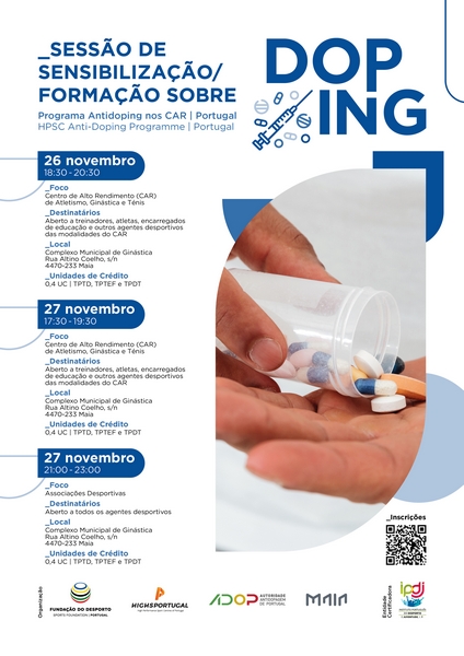 A Fundação do Desporto, a Autoridade Antidopagem de Portugal e o Centro de Alto Rendimento da Maia (C.M. da Maia) vão promover Sessões de Sensibilização e Formação sobre Doping. Estas sessões são certificadas pelo IPDJ, I.P., conferindo créditos para os títulos profissionais de TPTD, TPTEF e TPDT.