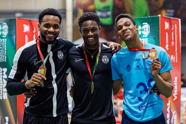 Abdel Larrinaga (à esq.) e Edson Gomes (no centro), ambos do Sporting CP e (à dir.) o atleta guineense do Clube de Atletismo Olímpico Vianense, Ussumani Djumo. Foto: Sergio Martins