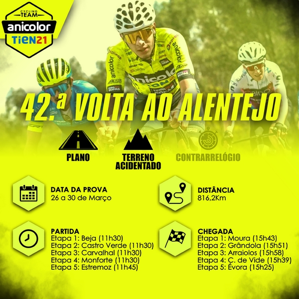 Entre amanhã e domingo, de 26 a 30 de março, a Equipa Profissional de Ciclismo Anicolor / Tien21 disputa a 42.ª edição da Volta ao Alentejo. Ao longo de cinco dias serão percorridos 816,9 km, onde estarão envolvidos 30 municípios. O tiro de partida será dado esta quarta-feira em Beja, com o final a cumprir a tradição na cidade de Évora, Património da Humanidade, onde a Praça do Giraldo vai voltar a coroar o vencedor, desta vez de 2025.
