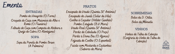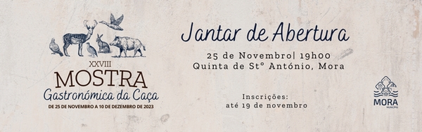O jantar que assinala o arranque da Mostra Gastronómica da Caça do Concelho de Mora acontece a 25 de novembro, na Quinta de Santo António, e conta com a degustação de 14 pratos confecionados pelos restaurantes aderentes. Peças de caça como o javali, a perdiz, o pombo, o faisão, o veado, a lebre, entre outros, estarão na base da confeção dos pratos, que farão as delícias dos participantes apreciadores desta vertente gastronómica.