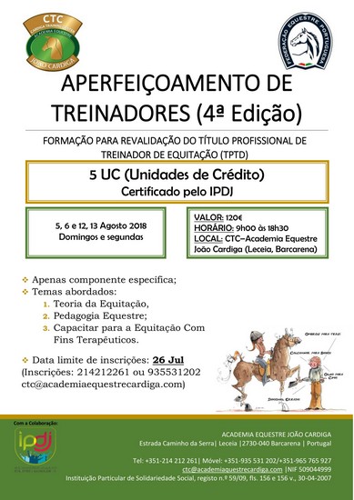 Estão abertas as inscrições para a 4ª edição da formação “APERFEIÇOAMENTO DE TREINADORES”, que se realizará no Cardiga Training Center, polo de formação, da Academia Equestre João Cardiga, em Barcarena, Oeiras, dias 5, 6, 12 e 13 de Agosto 2018 (domingos e segundas feiras).