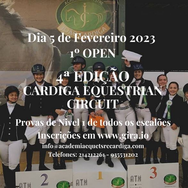 A Academia Equestre João Cardiga vai abrir a época desportiva 2023, com o 1º OPEN do Cardiga Equestrian Circuit, que se realizará no domingo, dia 05 de Fevereiro, a partir das 14h30, nas suas instalações em Barcarena, Oeiras.
