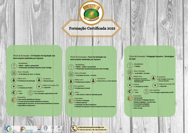 A Academia Equestre João Cardiga vai, através do seu polo de formação – Cardiga Training Center – ser palco, de diversas ações de formação dedicadas à temática da saúde, reabilitação, bem estar e desporto, todas certificadas pela DGERT, IPDJ e com acesso ao Passaporte Qualifica.