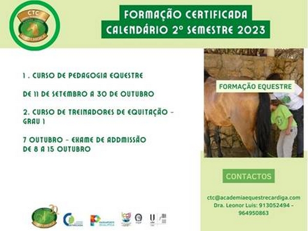 Estão abertas as inscrições, até dia 25 Setembro, para o Curso de Treinadores de Grau 1 cujo exame de admissão será realizado, dia 7 de Outubro, na Academia Equestre João Cardiga, em Barcarena – Oeiras.