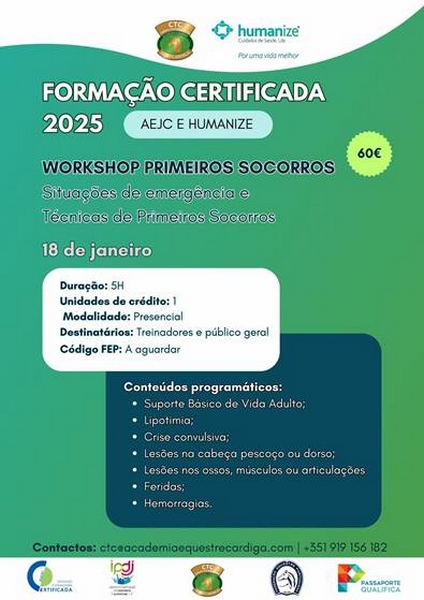 A 18 de Janeiro realiza-se a primeira formação do ano, com uma parceria entre o CTC e a HUMANIZE. Um WORKSHOP sobre “SITUAÇÕES DE EMERGENCIA E TÉCNICAS DE PRIMEIROS SOCORROS” (ver cartaz em anexo)