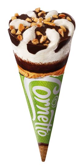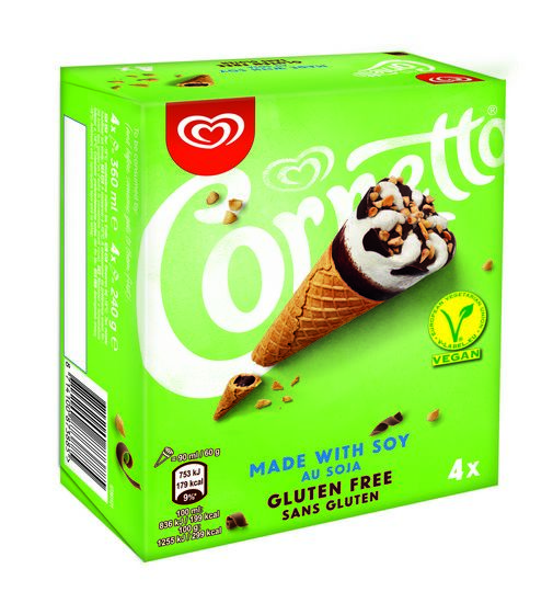 O Cornetto Clássico de sempre, com o seu cremoso gelado feito com leite de soja, mergulhado em chocolate vegan, contrastando com a crocante bolacha isenta de glúten.