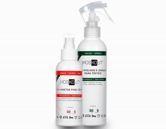 O Moskout Anti- Insetosfoi desenvolvido com o objetivo de evitar a picada de mosquitos responsáveis pela transmissão de doenças como o Dengue, a Malária ou a Zika, e partindo do pressuposto de que 40% das picadas de insetos acontecem por cima da roupa. Este spray repelente pensado para o vestuário e não para o corpo tem um efeito radial de 50 cm e revela uma grande eficácia contra todo o tipo de mosquitos, evitando assim as indesejadas reações alérgicas como vermelhidões e inchaços, para além da contaminação de doenças mais graves. A aplicação é muito simples (basta pulverizar os tecidos e deixar secar durante 2 minutos) e pode ser usado em t-shirts, calções, meias, vestidos,chapéus, tendas de campismo, interior dos automóveis e até nos carrinhos de bebé.