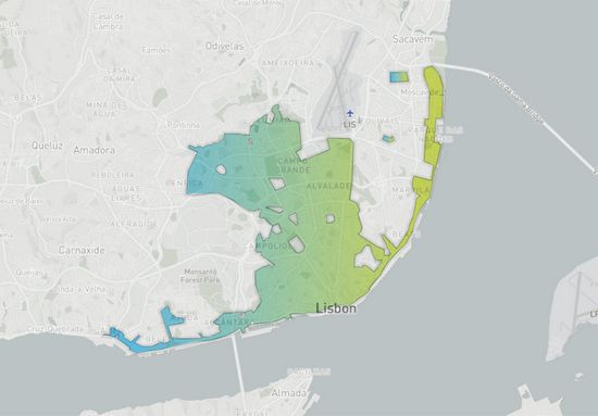 Zonas de utilização da eCooltra em Lisboa, com maior densidade no centro de Lisboa e com dois ramos que se estendem até à periferia, um em direção a Algés e outro em direção ao Parque das Nações