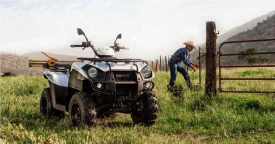 Os vidros dos piscas são visivelmente mais atrativos face à versão anterior deste ATV Kawasaki, que inclui agora tomada para engate de reboque e mantém a capacidade para dois passageiros.