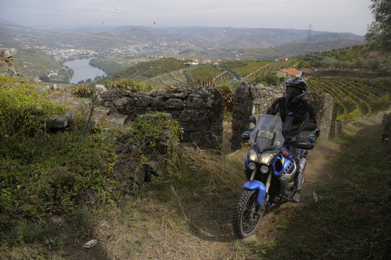 Tempo para mudança de paisagem, com os vinhedos durienses a despontarem à saída de Vila Real, com espetaculares vistas e mais castanheiros e carvalhos na travessia da antiga Linha do Corgo, ligação ferroviária entre Chaves e a Régua, desativada em 2010. Afinal, mudam-se os tempos…mudam-se as formas de transporte, com o altivo viaduto da A4 que liga as duas escarpadas margens do rio Corgo sobranceiro ao traçado da antiga linha de comboio. Vinhas e mais vinhas que se prolongaram até às margens do Douro, com paragem na Régua para reforço alimentar que antecipava gasto de energias que aí vinha. É que, se até aí foi o pó o maior obstáculo dos mototuristas, as verdadeiras exigências, momentos de pôr à prova a destreza de condução, surgiam a seguir, com as íngremes subidas em pedra a obrigarem muitos participantes a paragens forçadas. Valeu a belíssima paisagem que sempre ajudava… a descomprimir e recuperar o fôlego para mais uns quantos quilómetros!