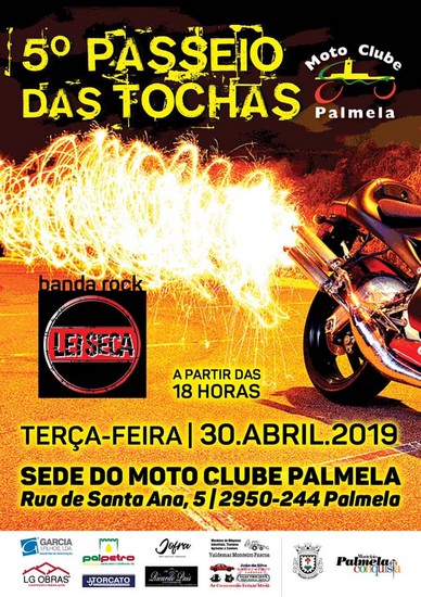 O passeio motard noturno, com tochas, vai juntar, como já é tradição, dezenas de motards em desfile pelas artérias da Vila, terminando com música ao vivo, na sede do Moto Clube de Palmela (Rua de Santa Ana), com a Banda Rock “Lei Seca”.