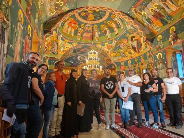 Sim, mal saímos de Idanha-a-Nova, o roadbook – divertido e muito ilustrado pela Susaninha – mandou-nos para o Mosteiro Ortodoxo Romeno da Dormição da Santíssima Mãe de Deus. Bom, lá pensámos “mais uma igreja ou ermida…” Mas, quando numa região árida, entramos num recinto tão fresco, florido e relvado, povoado de casas de madeira trabalhada, sentimos logo que estamos perante um local especial e diferente. E, à entrada da igreja, foi preciso segurar os queixos aos mototuristas. O espanto e assombro perante o colorido das paredes e tetos fez gastar as baterias aos telemóveis com tanta foto e vídeo. E a simpatia das Irmãs e sacerdotes é tal que recomendamos a todos o desvio a este recanto de paz na orla da Aldeia de Santa Margarida.