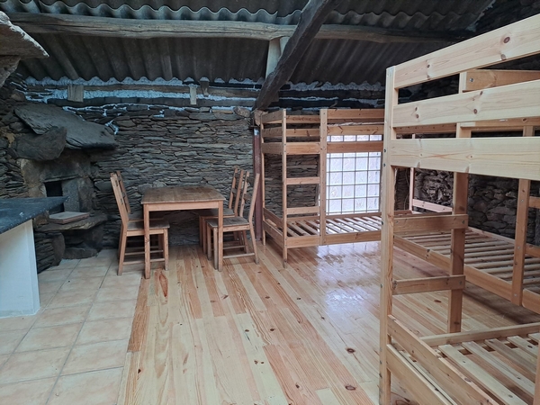 Além do espaço ocupado pelos beliches, o albergue possui instalações sanitárias com duche, uma cozinha equipada com o essencial, incluindo fogão, frigorífico, louça e talheres, e uma área para estender roupa.