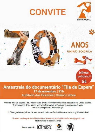 A celebração do 70º aniversário da União Zoófila conta com a participação de diferentes convidados com trabalho reconhecido na protecção dos animais, assim como na governação da cidade e do país. Será apresentado em estreia o documentário “Fila de Espera”, produzido por João Brazão – voluntário e realizador de cinema –, que retrata a vida dos cães e gatos que esperam (e esperam) na União Zoófila e o trabalho dos homens e mulheres, voluntários, que deles cuidam e por eles se entregam.