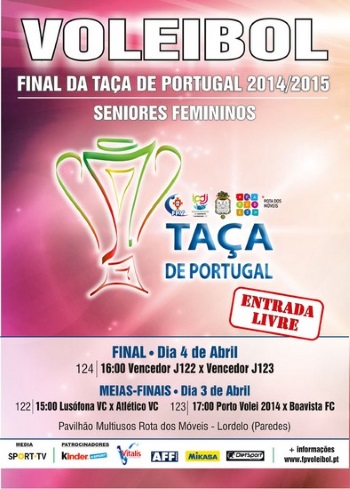 Lusófona VC x Atlético VC e Porto Vólei 2014 x Boavista FC e são os jogos das meias-finais da Final 4 da Taça de Portugal - seniores femininos, que se disputa nos dias 3 e 4 de Abril, com entrada livre, no Pavilhão Rota dos Móveis, em Lordelo (Paredes), sendo organizada pela Federação Portuguesa de Voleibol e pela Associação de Voleibol do Porto, com o apoio da Câmara Municipal de Paredes.