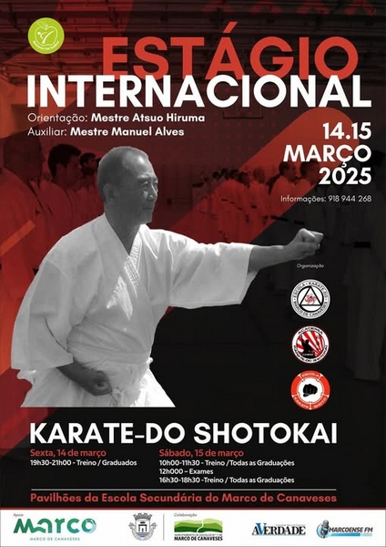 O Estágio Internacional de Karate-Do Shotokai vai realizar-se em Marco de Canavezes nos dias 14 e 15 de Março com um programa partilhado com espaço dedicado a alunos mais graduados e também para alunos de outras graduações. Será sobre a orientação do Mestre Atsuo Hiruma, tendo como seu auxiliar o Mestre Manuel Alves.